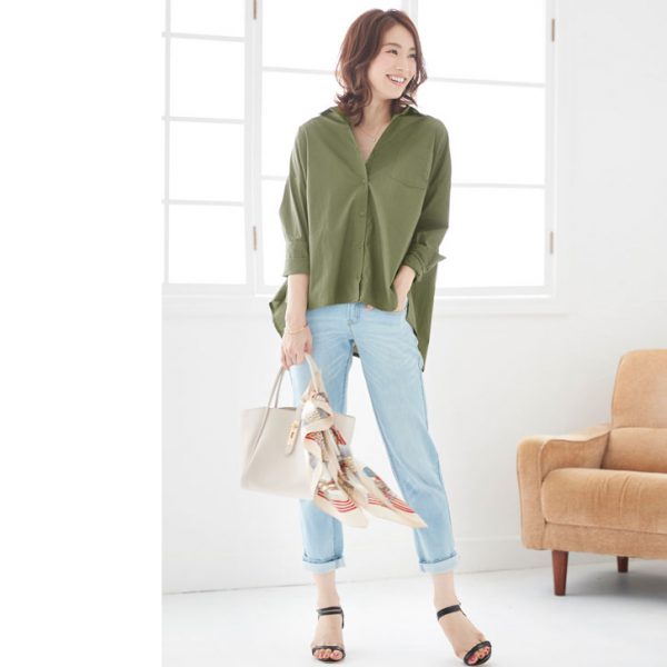 カーキとデニムの組合わせはカジュアルなイメージですが、袖口や足元などを少し肌見せすることで女性らしさが増し、抜け感が作れます◎