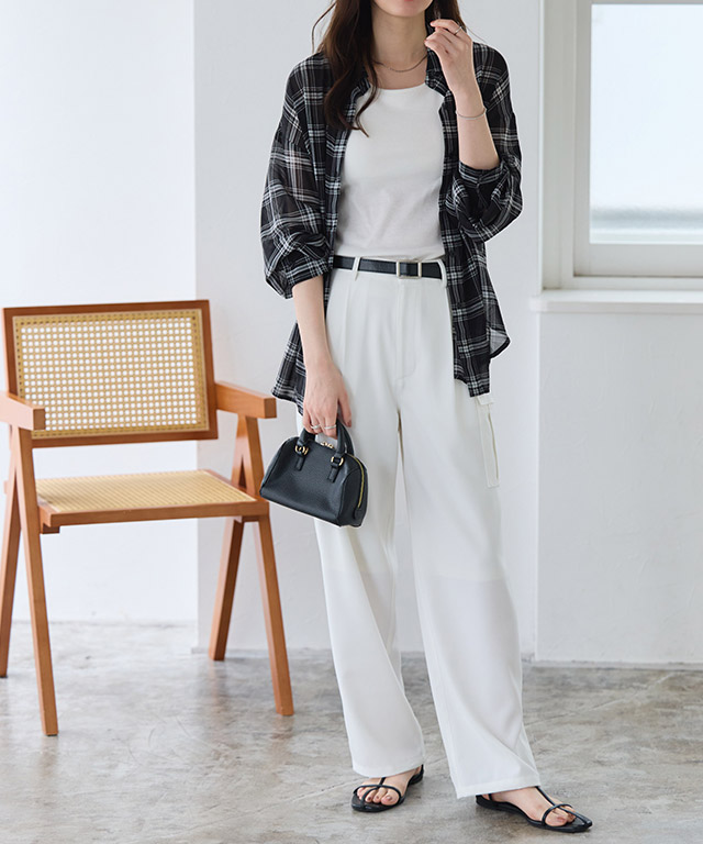 トップス、ボトムス、小物、どれか1つでもバランスを間違えるとスタイルのバランスが野暮ったくみえます。トップスはお尻がすっぽりと隠れ、太ももあたりまで丈があり、ゆとりのあるものをチョイス!パンツも同じく身体のラインを拾い過ぎないワイドパンツやロングスカートを選ぶと自然にIラインシルエットに!
