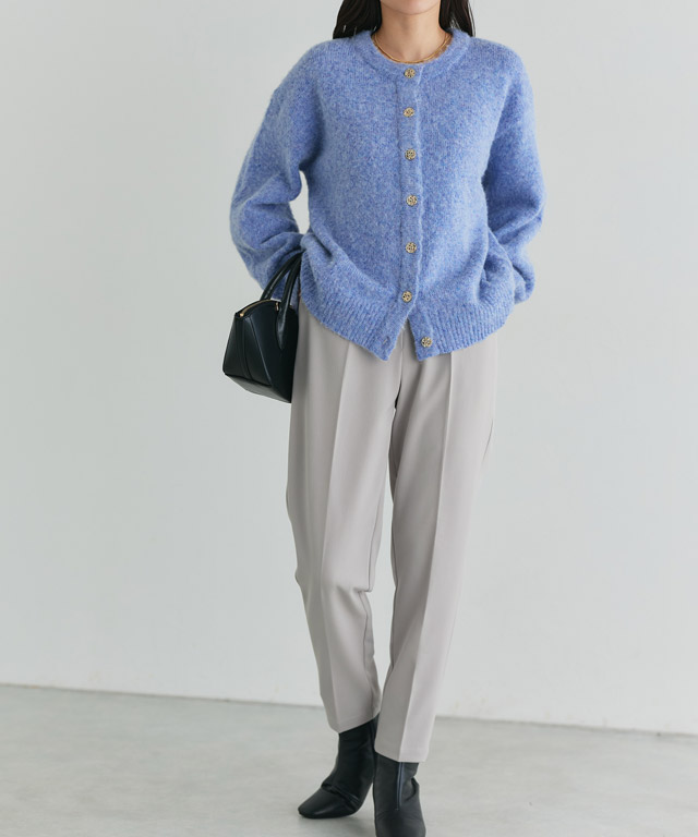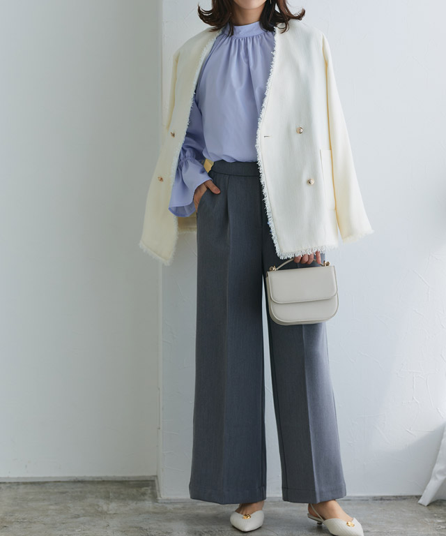 トップスは落ち感のあるキレイめブラウス、足元にピンヒールをINすることで、清潔感漂う大人上品スタイルに♪