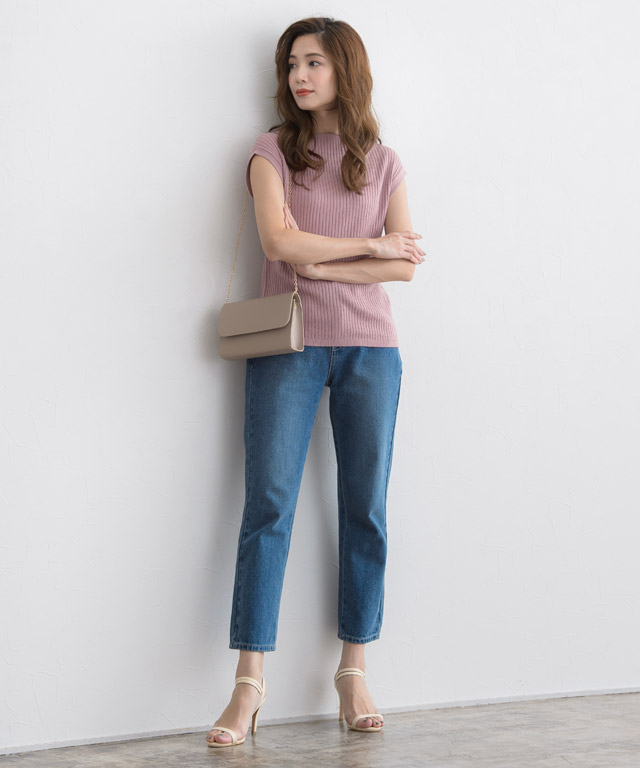 カジュアルなデニムボトムにくすみピンクのフレンチスリーブトップスを着るとカジュアルすぎない大人フェミニンな雰囲気に◎さらにホワイトのアンクルストラップのサンダルを履くと足首も綺麗に見えて女性らしさが漂いますよ。コンパクトなモカベージュのバッグを合わせて上品さもプラス♪