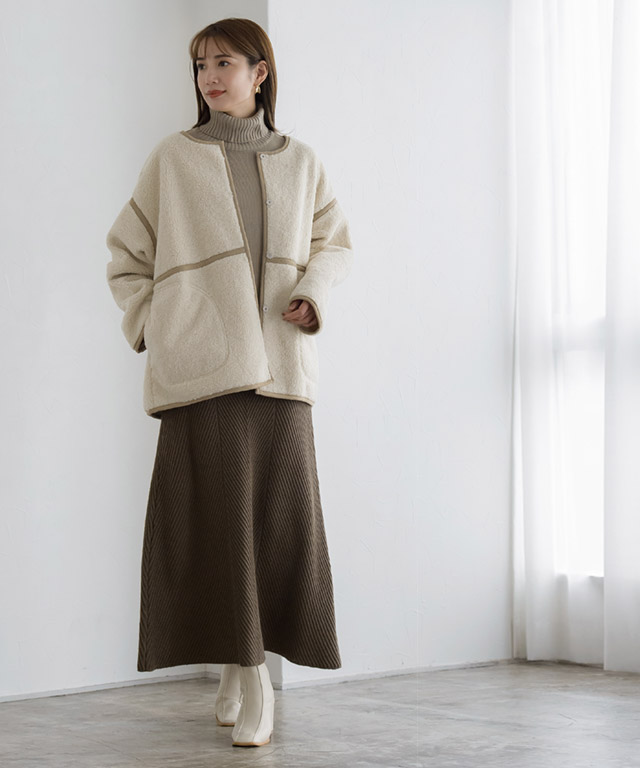 ボトムスのスカートも、凸凹の素材感あるしっかりした生地が暖かみとシーズンムードを高めてくれます。