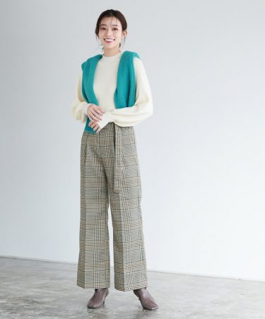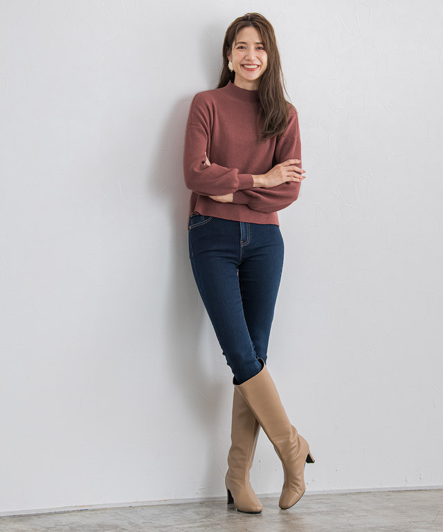 トップスには一枚でトレンド感のあるクロップド丈のハイネックニット。ニットはAWの雰囲気をプラスするベイクド系ピンクカラーと、程よく女性らしさを演出するボリュームスリーブがフェミニンさもプラスします。ボトムはベーシックなデニムにロングブーツの安定感のある組み合わせがさらにスタイルUPを叶えます。シンプルながらも大人カジュアルな仕上がりに。