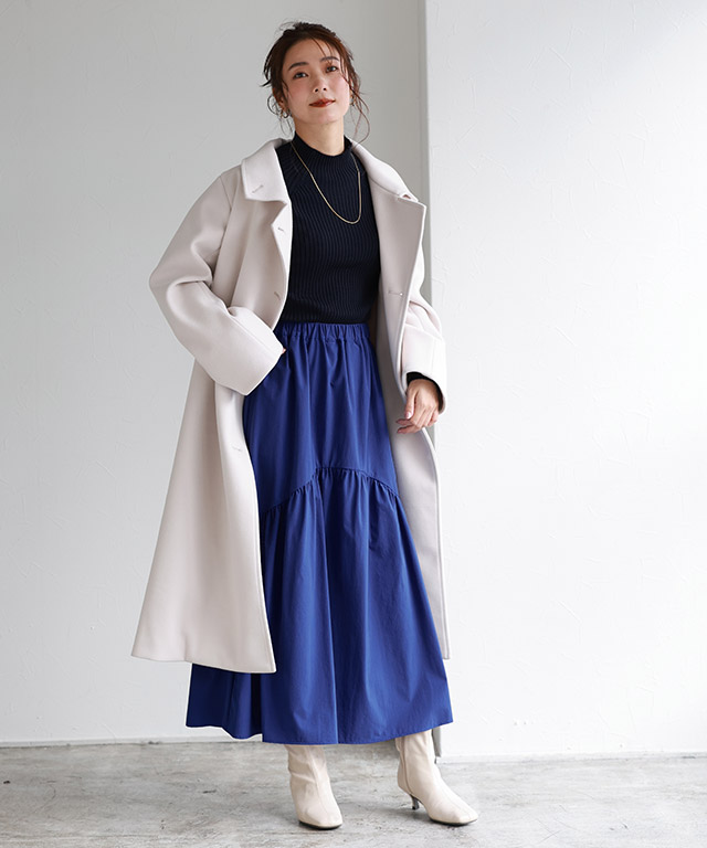 スカートはアーチギャザーデザインの効いた一枚でスタイリッシュさを意識したコーディネートです。コートはスタンドにもチェスターにもマルチにシルエットが変わるアイテムが、寒さにも対応◎