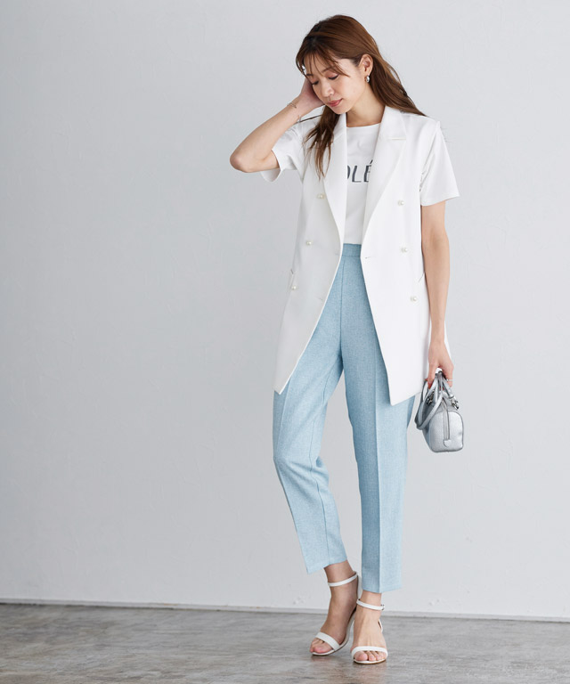 定番になりつつあるジレコーデも、パールが付いたジレが華やかな印象に。トレンドのツイードパンツを合わせて、きれいめかつ旬な要素をプラスしました。インナーはロゴTでシンプルながらも、きれいめすぎない大人カジュアルな雰囲気に。足元は華奢なヒールで女性らしさを出しつつ、シルバーのバッグが爽やかさとお洒落なアクセントになってくれます。