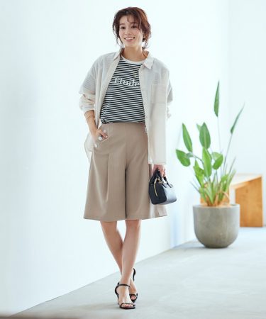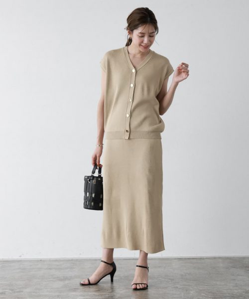 マリンテイストなゴールドボタンのニットベストには、きれいめな印象のIラインスカートを合わせてバランスの良いニットアップスタイルに。素材はリネンタッチでシーズンムードをより引き立てると◎足元にはサンダルを選んで抜け感をプラス。ベージュ×ブラックの色合わせで上品かつ大人っぽい印象に仕上げましょう。