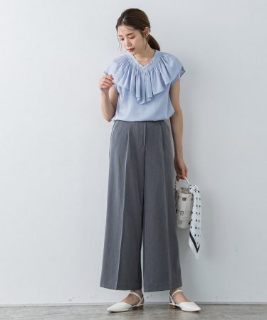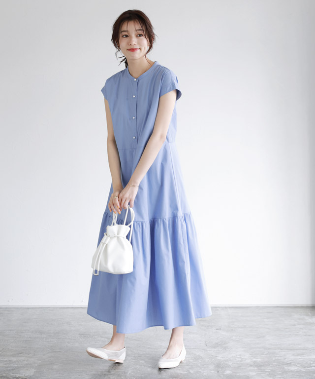 華やかなパールボタンデザインは女性らしいフェミニンスタイルに導いてくれます。バンドカラーで顔周りをすっきりさせつつ、裾のボリュームギャザーがメリハリのあるシルエットを演出します。程良く肩周りを隠してくれるフレンチスリーブは華奢見えし、すっきりとしたバランスに見せてくれるポイント◎小物はホワイトでまとめて爽やかなフェミニンスタイルが完成します。