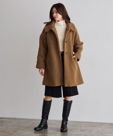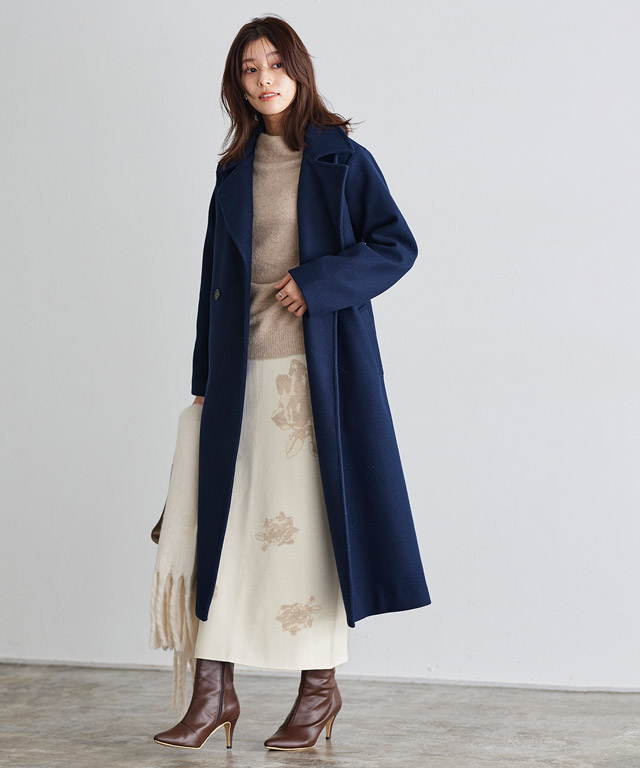 シンプルなスタイリングにもトレンド感をプラスしてくれるシャギーニットと、花柄のニットスカートを合わせて女性らしさ溢れるスタイリングに。ベージュとアイボリーのニュアンスカラーで柔らかな印象へと導きます。足元まであるネイビーのロングコートが膨張しがちなカラーコーデも全体をすっきりと引き締めてくれます。小物は同系色のブラウンで揃えて大人の上品さのあるスタイリングに仕上げました。