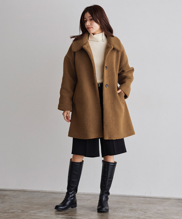 もこもこの表面感がトレンドムードをプラスし、コーデの主役にもなるボアコート。ボリューム感たっぷりのシルエットなのでインナーはハイネックニットを合わせてすっきりと。ボトムはハーフパンツとロングブーツでバランスの良いスタイリングに仕上げました。落ち着いた色味を選ぶことで子供っぽくならず、一気に上級者コーデへと格上げしてくれるコーデです。
