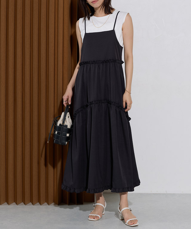 ウエストから段々に広がるティアードデザインとフリル使いがかわいいアイテム。ブラックなら甘くなりすぎないので大人女子でも着やすい!インナーを変えたり、セットのノースリーブシャツを1枚のトップスとしてスタイリングしたり、それぞれ自由に着こなしを楽しめます。デイリーはもちろん、休日のお出かけやリゾートにもおすすめ。