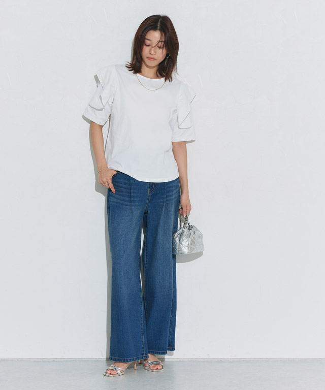 ラッフルスリーブで個性的に仕上げたデザインTシャツがメインのコーデ。合わせるボトムスを選ばないのでオンオフ問わずデイリーに着用できます。パンツはデニム特有の硬さを軽減した、程よいハリと柔らかさを兼ね備えた生地感。小物はシルバーをチョイスするとエッジが効いて、シンプルなのにどこか新鮮な周りと差がつくコーデに♪