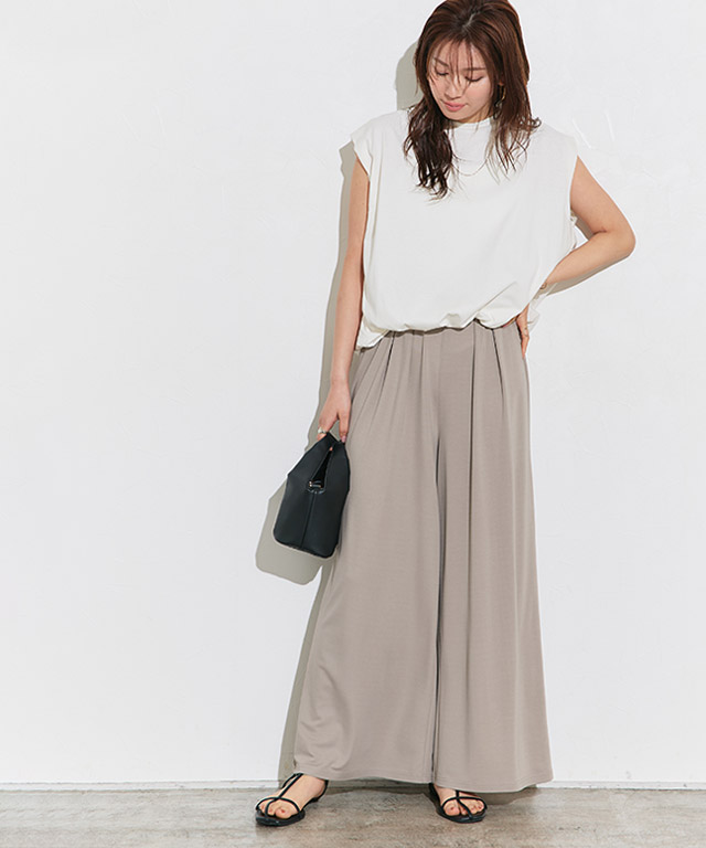 汗ばむ季節はおしゃれだけでなく着心地の良さも追求したい!肌離れの良いサラッとした生地のトップスは身頃に程よくゆとりがあり、裾部分を好みに合わせて絞れるドロスト仕様。リラクシーなワイドパンツはひんやりと気持ち良い接触冷感機能があり、ややとろみと艶のある風合いです。シルエットと素材にこだわって暑い季節を快適に過ごしましょう♪