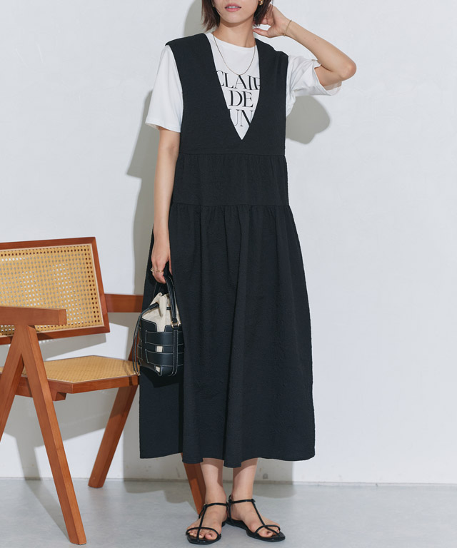 カジュアルなロゴTシャツに、ふんわりとしたシルエットの黒ジャンスカを重ねた、リラックス感のあるレイヤードスタイル。ワンピースは、インナー次第で様々な表情が楽しめます。足元は華奢なストラップのサンダルを合わせることで、女性らしさをプラスしました。バッグは黒と白のバイカラーのミニバッグで、コーディネートを引き締めます。アクセサリーは控えめにして、ワンピースのシルエットとレイヤードを楽しめるようにまとめて。ちょっとしたお出かけや、リゾートスタイルにもおすすめです。