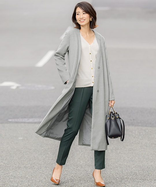ONスタイルの定番“カーデ×キレイめパンツ”は深みグリーン投入で周りと差をつける色使いへ。一見取り入れにくそうなグリーンのボトムですが、定番のモノトーンはもちろん、ネイビーやブラウンなどのカラーとも相性抜群!