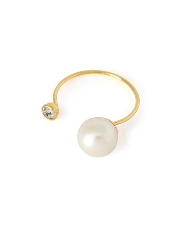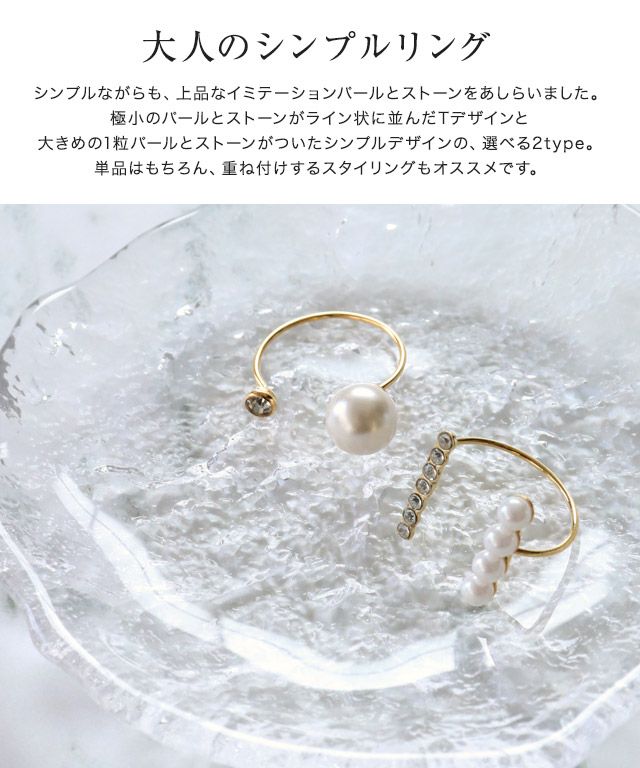 極小のパールとストーンがライン状に並んだTデザインと大きめの1粒パールとストーンがついたシンプルデザインの、選べる2type。単品はもちろん、重ね付けするスタイリングもオススメです。