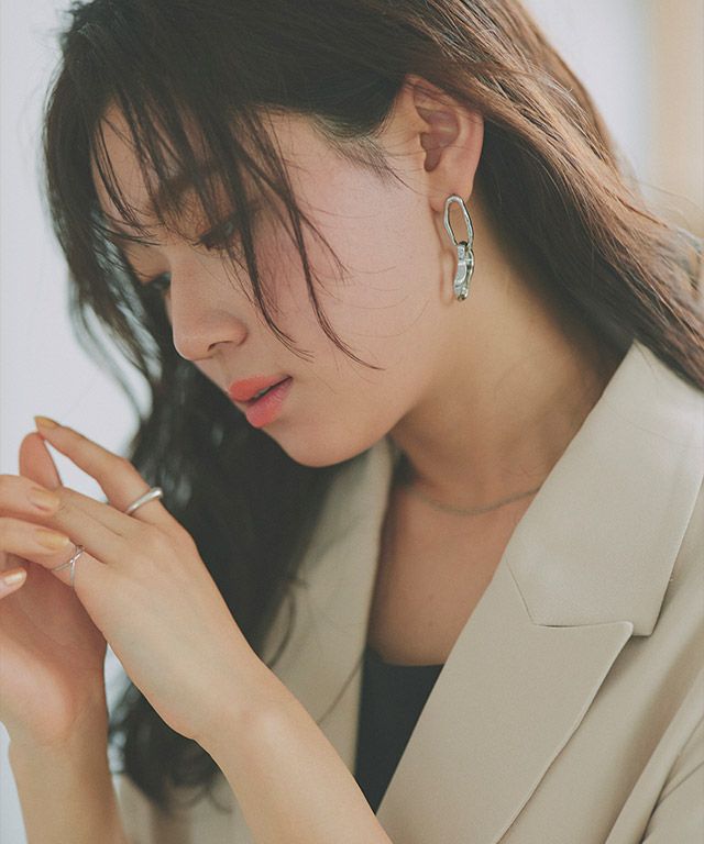デザイン違いのリングを連ねて、動く度に揺れるシルエットがシンプルコーデにアクセントを加えます。