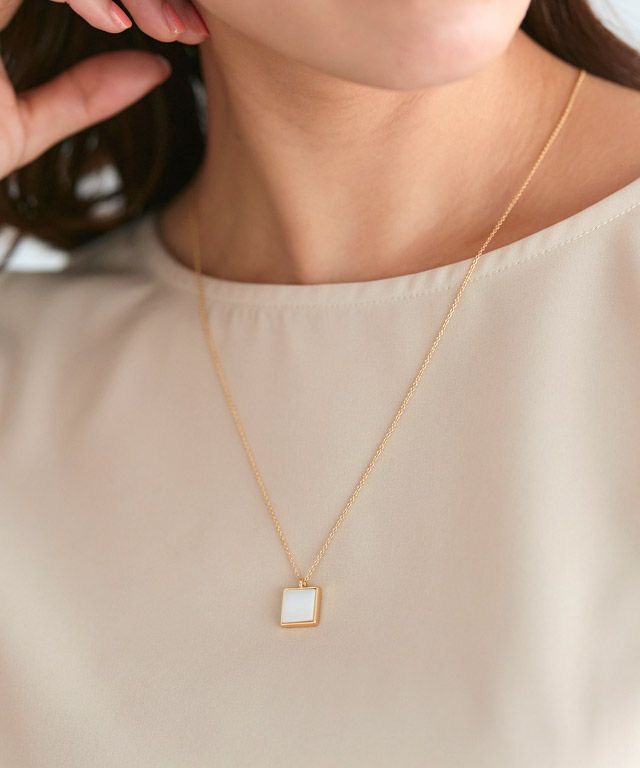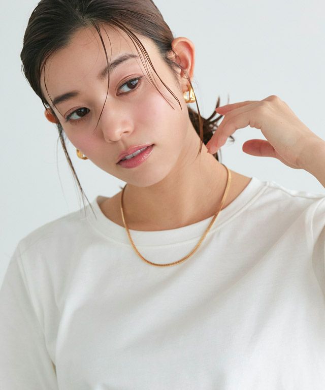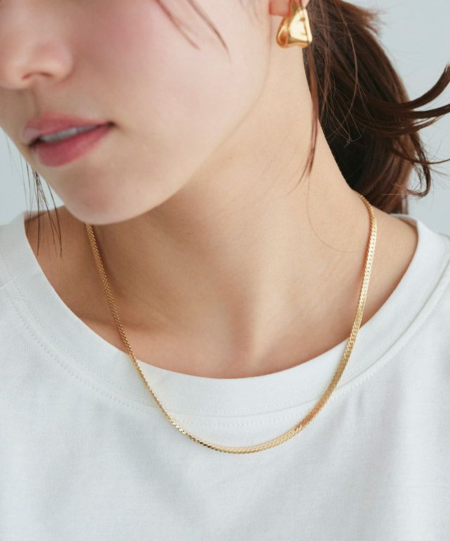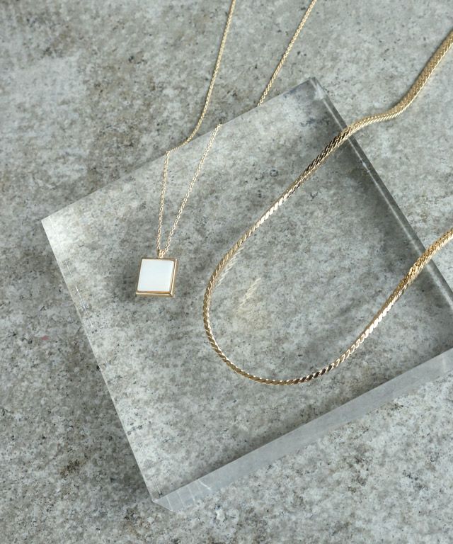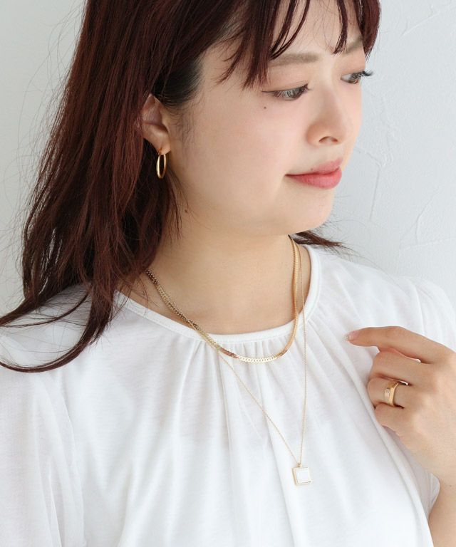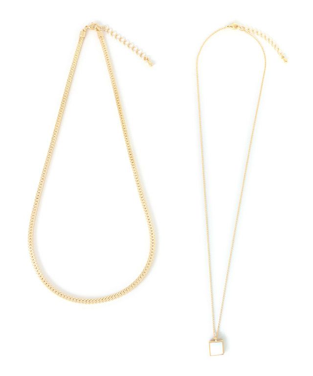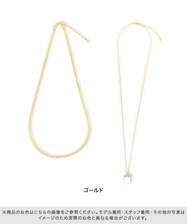繊細なチェーンにシェルトップをあしらった1本と、しっかりと太さのある角スネークチェーンが存在感を演出してくれる2本セットのネックレス。