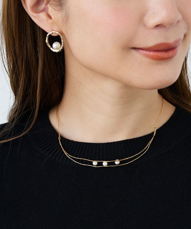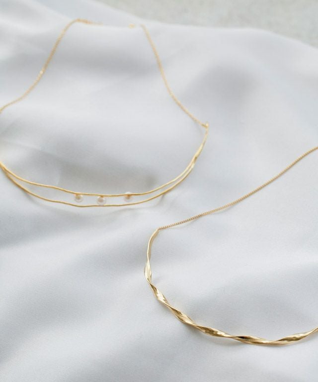 シーズンレスに着用できるように、チェーンはシンプルな細めのものをあしらいました。トップはスタリングに映えるツイストデザインと線形にパールをあしらったデザインで上品さを演出。