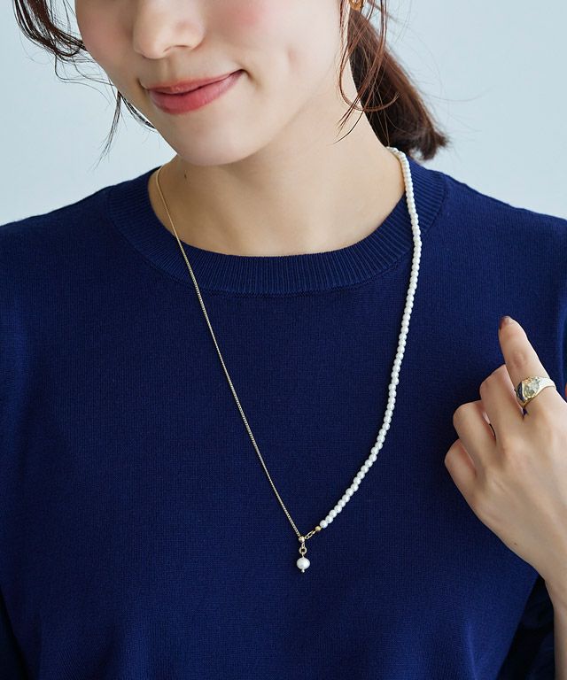 スライダーで、位置を変えて着用することで、シチュエーションレスに楽しめるデザインに。トップには淡水パールのアクセントをプラスしました。