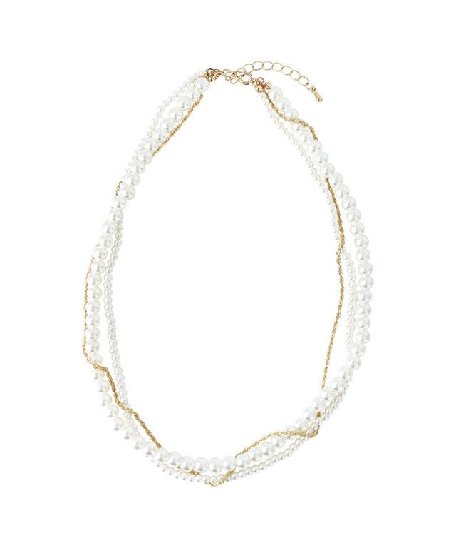 2サイズのイミテーションパールと、シンプルチェーンの3本を編み上げたデザインのネックレス。