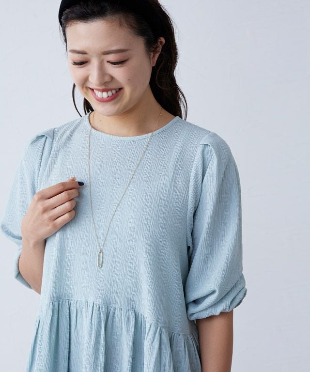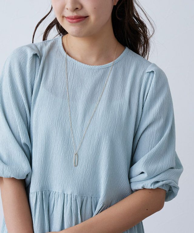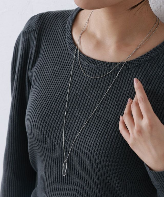 メタルリングはオーバルのもので縦長のアクセントをプラス。トップパーツを引き立てるシンプルながらも繊細なチェーンが女性らしさも演出します。セットのシンプルなチェーンネックと2連や別々でも着用でき、シチュエーションに合わせて楽しめます。