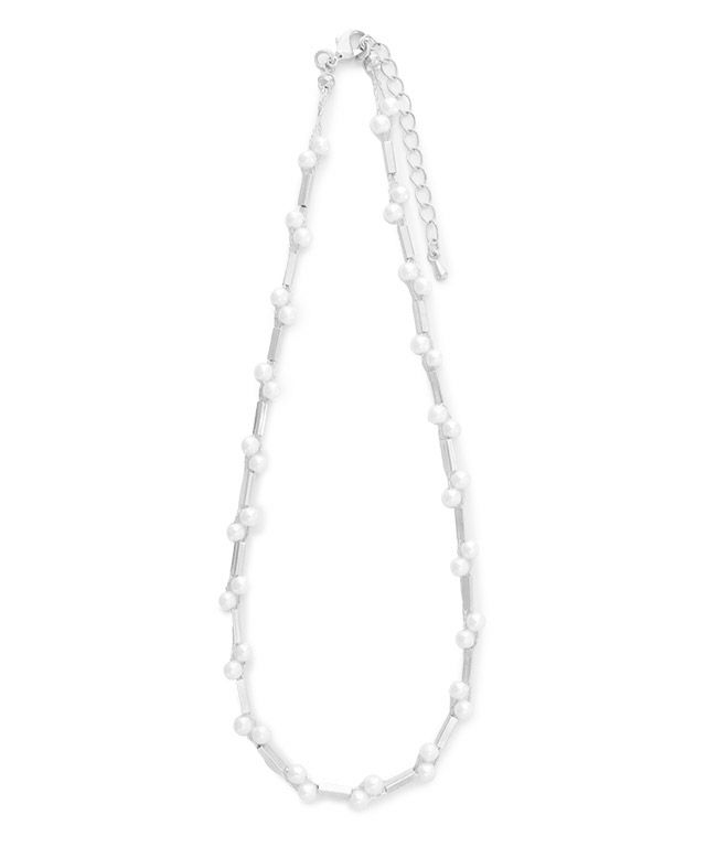 等間隔に連なったパイプパーツにきらきら輝くイミテーションパールがアクセントとして彩り、トレンドライクな印象に。インパクトのあるデザインネックレスとしてデイリーからオケージョンまで様々なシーンでご着用いただけます。