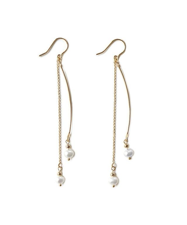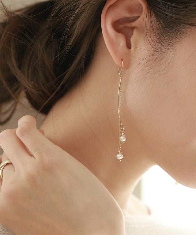 メタルピンは緩やかなカーブを描き、女性の柔らかさを表現。チェーンも極細のもので揺れる度に煌めきます。二本に長短を付けることで、顔周りのアクセントに。一番の魅力はピンとチェーンの先に付いた、淡水パールが上品な印象をプラスしてくれます。