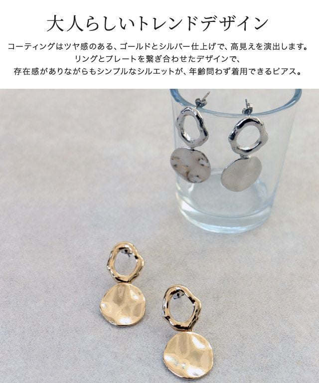 リングとプレートを繋ぎ合わせたデザインで、存在感がありながらもシンプルなシルエットが、年齢問わず着用できるピアス。
