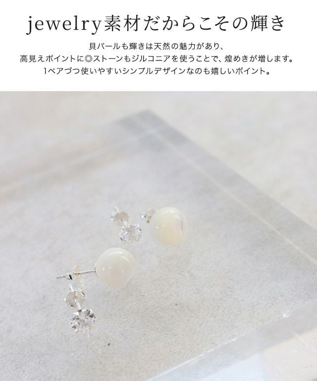 貝パールも輝きは天然の魅力があり、高見えポイントに◎ストーンもジルコニアを使うことで、煌めきが増します。1ペアづつ使いやすいシンプルデザインなのも嬉しいポイント。