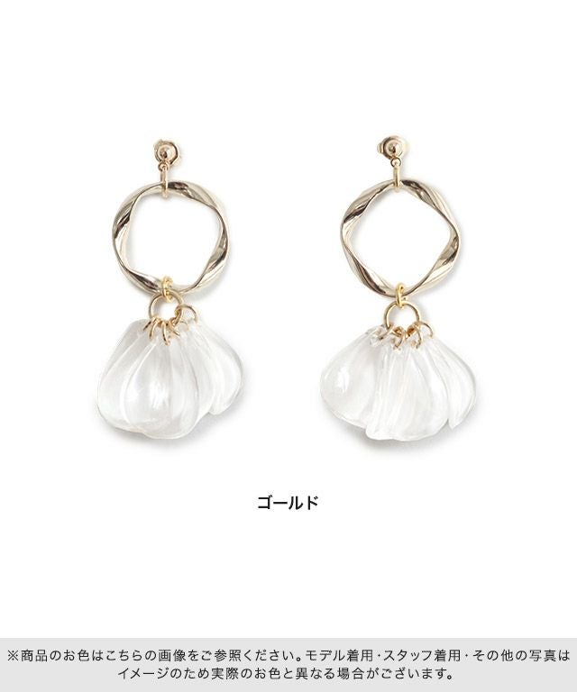 ツイストメタルリングに、クリアのペタルパーツで仕上げました。メタルリングをプラスすることで高級感を添えながら、大人でも楽しめるトレンド感のあるデザインのピアス。