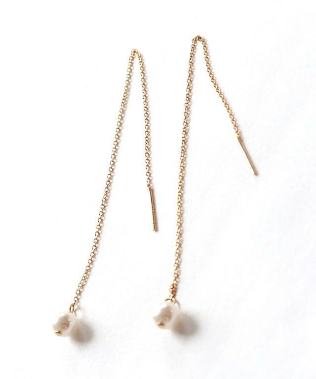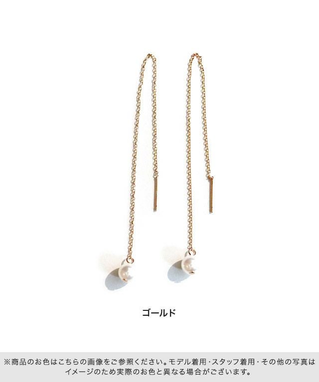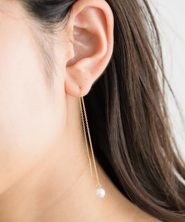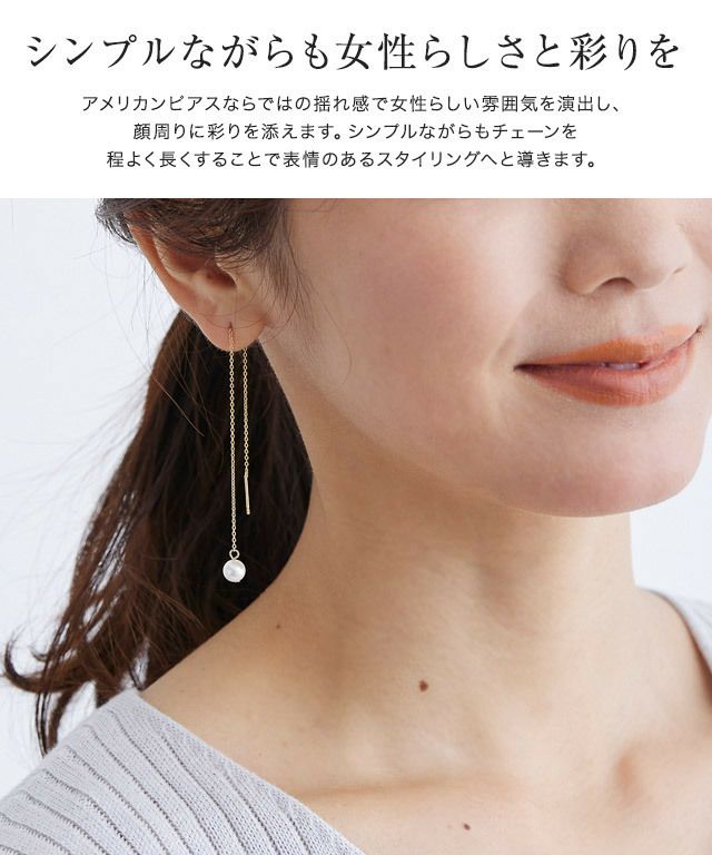 アメリカンピアスならではの揺れ感で女性らしい雰囲気を演出し、顔周りに彩を添えます。シンプルながらもチェーンを程よく長くすることで表情もあるので、スタイリングのアクセントにオススメ。