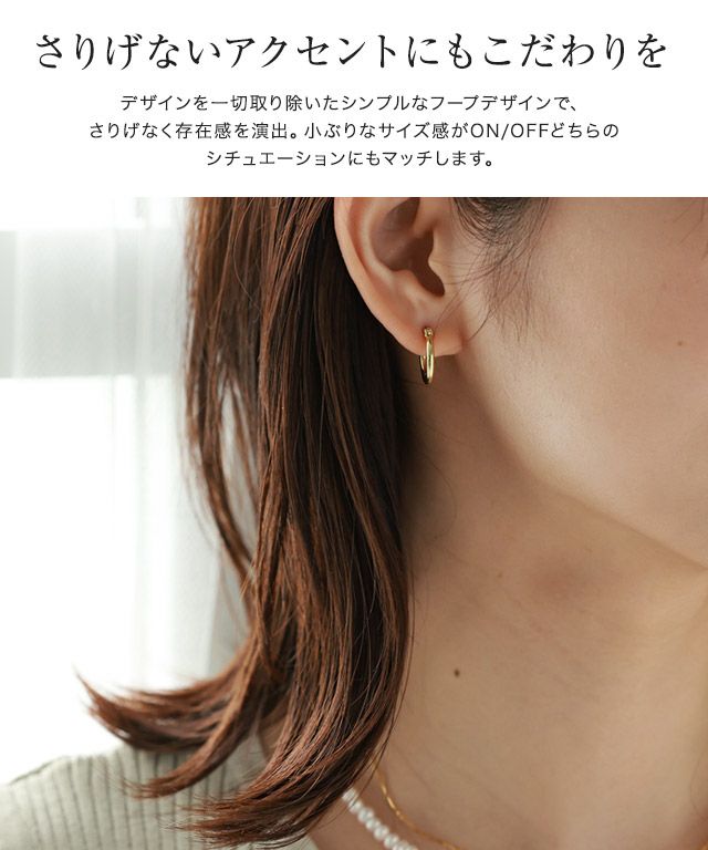 デザインを一切取り除いたシンプルなフープデザインで、さりげなく存在感を演出。小ぶりなサイズ感がON/OFFどちらのシチュエーションにもマッチします。