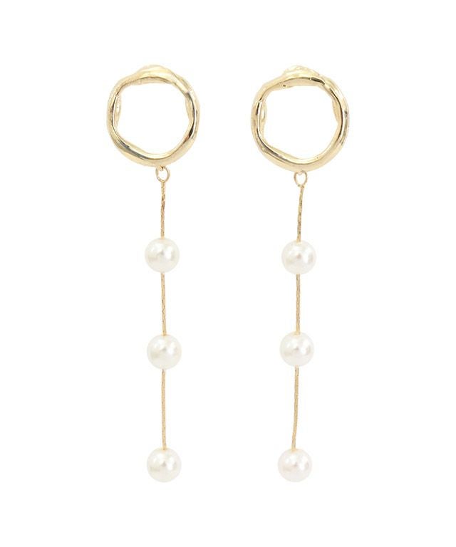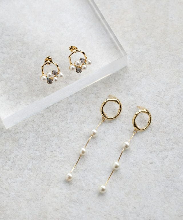 リングデザインにパールをあしらうことで、華奢ながらも表情のあるデザインに。それぞれ、チェーンとリングのデザインベースで女性らしさを引き立たせてくれるピアスです◎