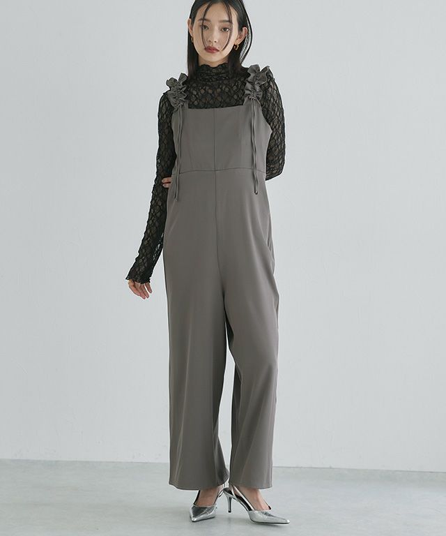 ショルダー部分に贅沢に施したフリルが効いた女性らしいオールインワン。肩のドロスト部分でパンツの長さが調整可能です。ウエスト部分にはシルエットを引き締めるデザインが施され、スタイルアップ効果も期待できます。後ろはリボンディテールで360度どこから見ても着映えるデザインです。