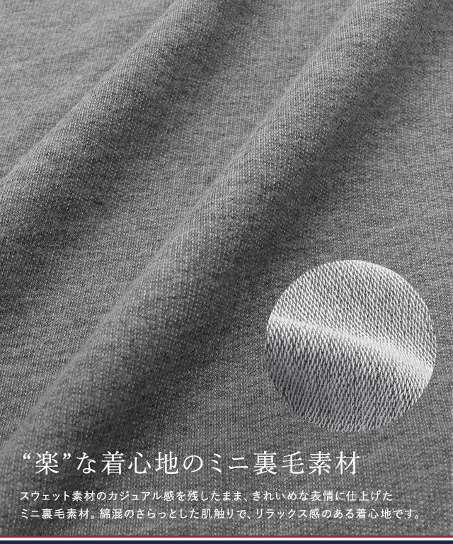 スウェット素材のカジュアル感を残したまま、きれいめな表情に仕上げたミニ裏毛素材。綿混のさらっとした肌触り素材で、体に馴染むリラックス感のある着心地です。