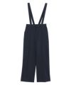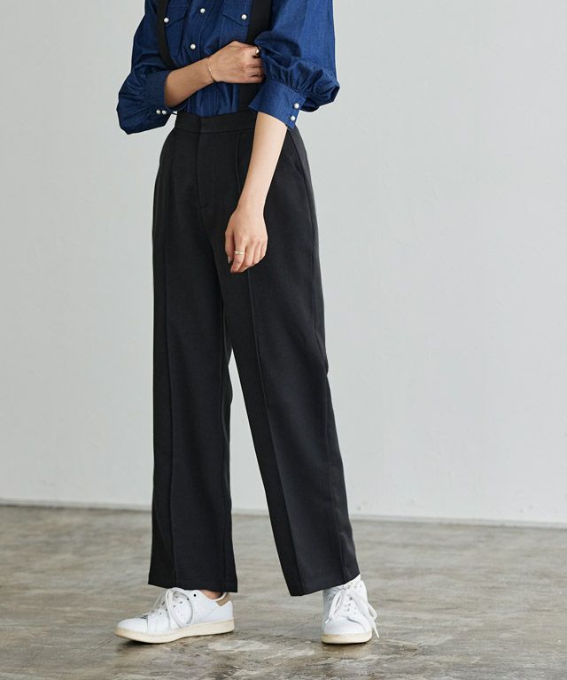 やや細めのストラップが取り外しもできるのがポイントのデザインパンツ。ストラップを外せばシンプルなストレートパンツとしても着用でき、インナーを選ばずシーズンレスで着回しやすいデザインです。