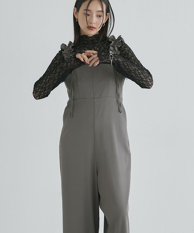 ショルダー部分に贅沢に施したフリルが効いた女性らしいオールインワン。肩のドロスト部分でパンツの長さが調整可能です。ウエスト部分にはシルエットを引き締めるデザインが施され、スタイルアップ効果も期待できます。後ろはリボンディテールで360度どこから見ても着映えるデザインです。