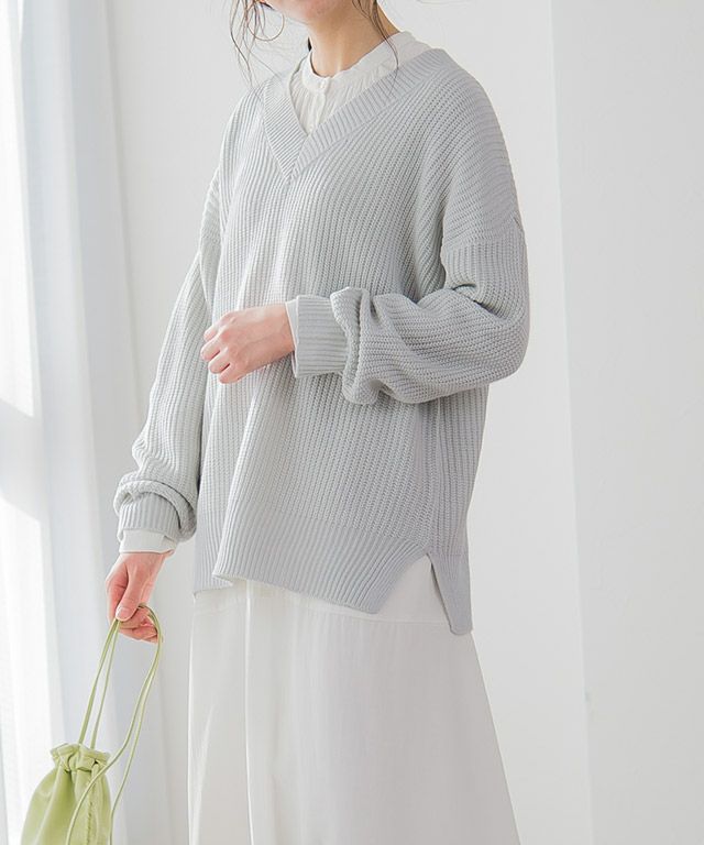 ゆったりとしたサイジングと、やや太めの袖がルーズな雰囲気漂うニット。ゆとりのあるサイジングなので、首元はVネックで抜け感をプラスしました。ボトムを選ばず合わせやすく、レイヤードスタイルや肩にかけるなど様々なテイストで着回せる一枚です。