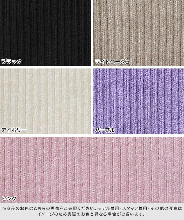 また、ニット製品は生産の過程上「生地を織る際の糸の継ぎ目」繊維の「混紡」、プレス加工、製品洗い加工によって形やサイズ(5cm前後)に誤差が生じる場合がございますが品質上の問題はございません。