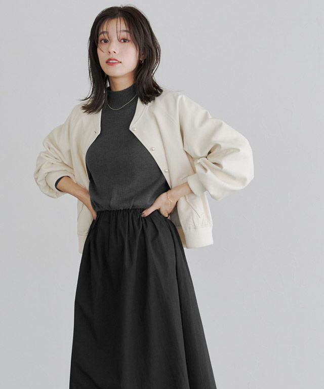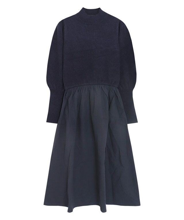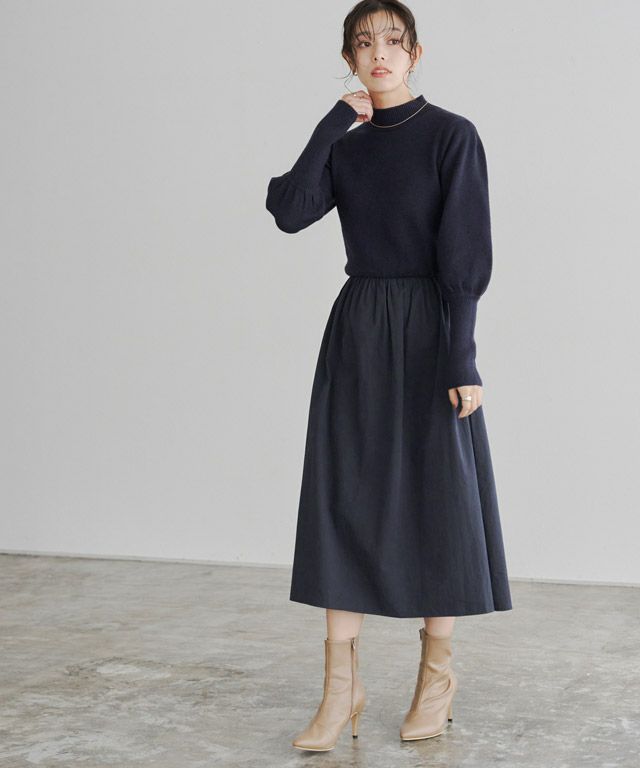 上はずっと触っていたくなるようなもちっとした肌触りのニット素材。スカート部分は綿100%でさらりとしていて、ハリ感があるのでシルエットをキープしてくれます。異素材ドッキングで存在感があり、着映える一枚です。