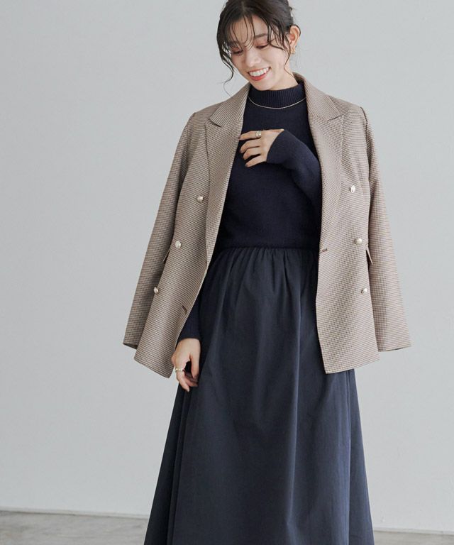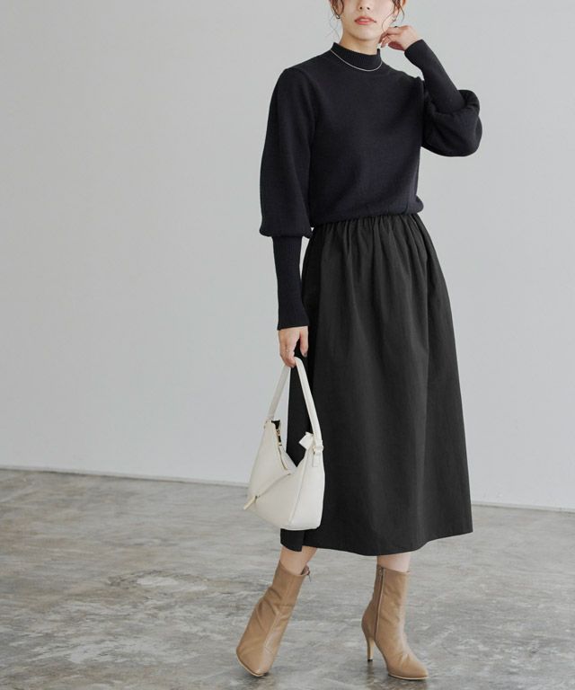 袖リブを長めにすることでメリハリがあり、ボリューム感が程良いアクセントに。首元はハイネックにしているのでタートルネックが苦手な方にもおすすめ。ウエストにギャザーを入れ、ふんわりと広がるシルエットが女性らしい雰囲気になるように仕上げました。