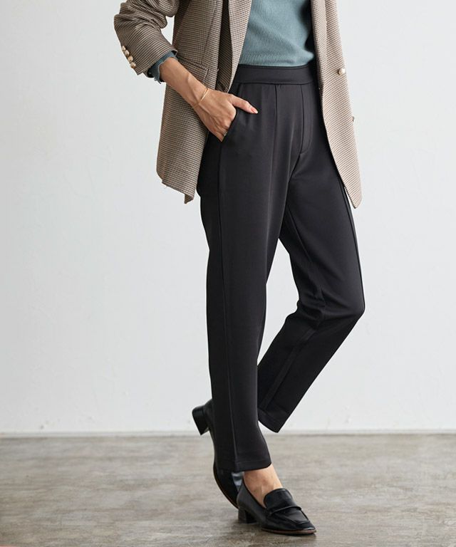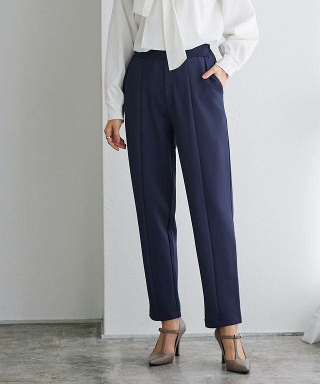 裾に向かって細くなるテーパードシルエットがすっきり見えを叶える一本。フロントの切替デザインが脚のラインをきれいに魅せてくれます。ウエストは後ろゴムの仕様にし、ストレスフリーな穿き心地に仕上げました。