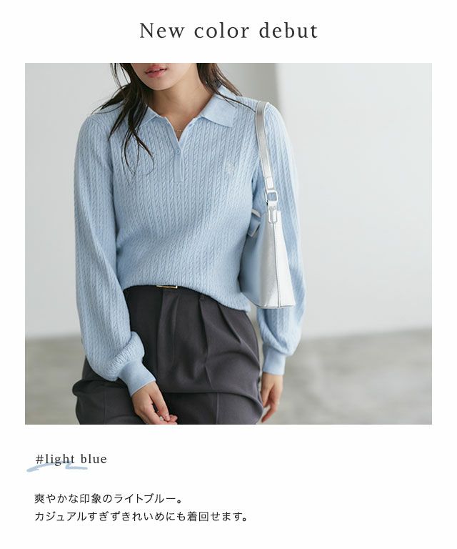 立体的なケーブルデザインを全面に施したポロニット。主張しすぎない細いラインで上品な印象へと導きます。レトロな印象のポロデザインに落とし込み、ボリュームのある袖が女性らしい雰囲気に。ボトムスを選ばず着回せるアイテムです。