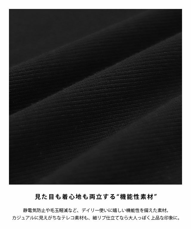 静電気防止と毛玉軽減を兼ね備えた機能素材。厚みのある風合いで、体のラインを拾いにくいところも魅力の一つです。カジュアルになりがちなテレコ素材でも細リブにすることで大人っぽく着られる一枚です。