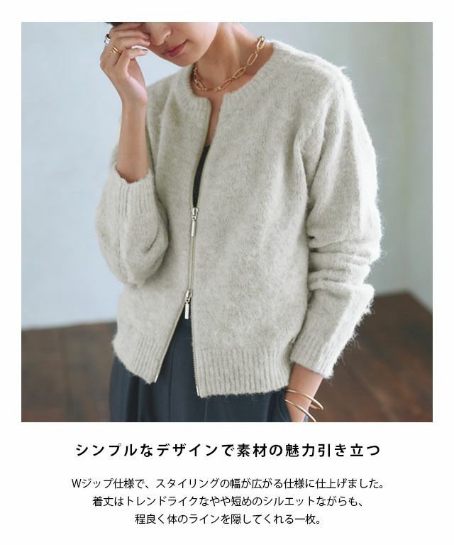 Wジップ仕様で、スタイリングの幅が広がる仕様に仕上げました。着丈はトレンドライクなやや短めのシルエットながらも、程良く体のラインを隠してくれる一枚。