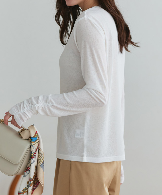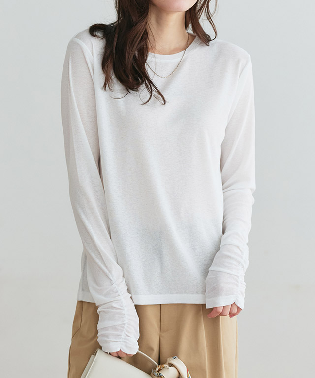 さりげない透け感で手元までこなれる“袖シャーリングシアーロングスリーブTシャツ”