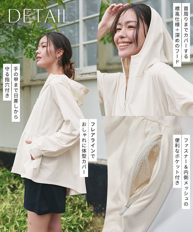 裾に向かって広がるフレアラインが、フェミニン感を演出。ウエストからヒップ周りの気になるラインもカバーしてくれます。やや深めのフードと、首をカバーしてくれる襟の高さにもこだわりました。指穴も付いているので手の甲まで守ってくれます。夏のアクティブシーンに欠かせない、デザイン性と機能性を兼ね備えたシリーズアイテムです。 こちらのアイテムにはあると便利なファスナーとメッシュ仕様のポケット付き。
