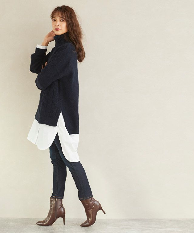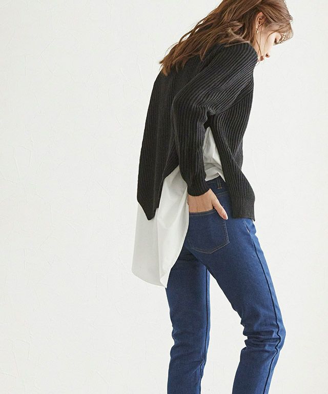 また、ニット製品は生産の過程上「生地を織る際の糸の継ぎ目」繊維の「混紡」、プレス加工、製品洗い加工によって形やサイズ(5cm前後)に誤差が生じる場合がございますが品質上の問題はございません。