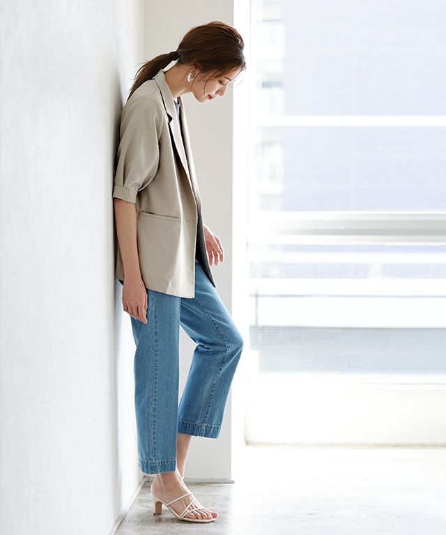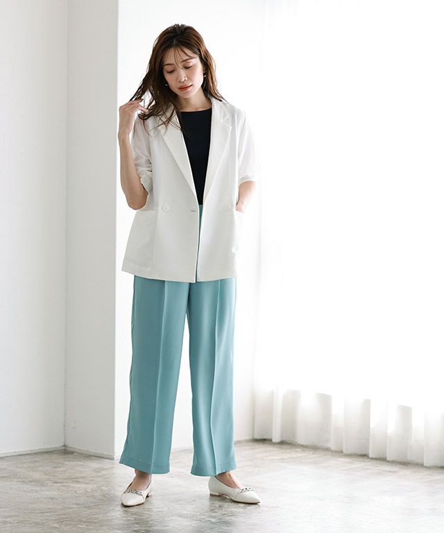 落ち感があり滑らかな肌触りのレーヨン混素材。程よく厚みがあり大人っぽいシルエットへと導きます。