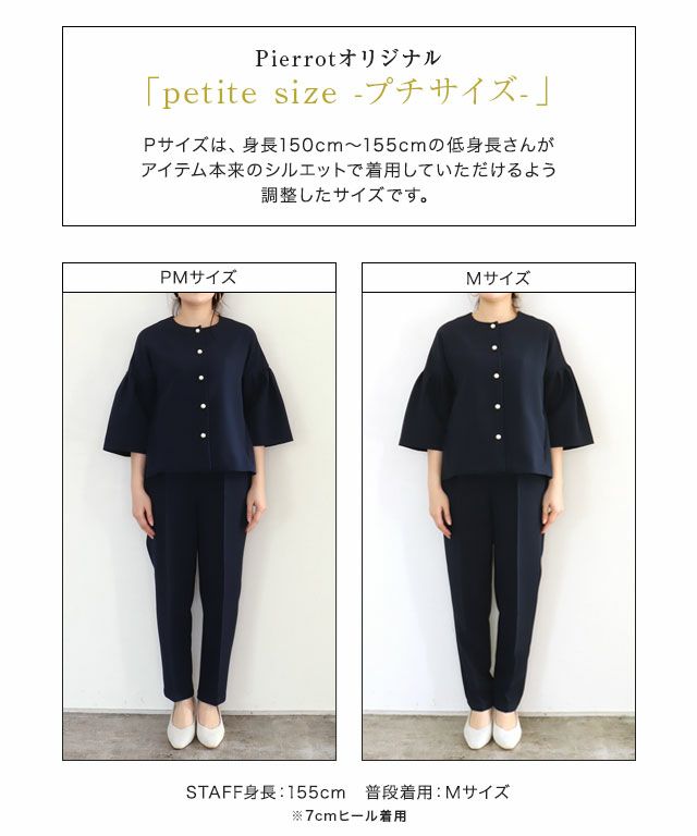 フラットシューズでも、ヒールでもすっきりと見えるPMサイズを選びます。