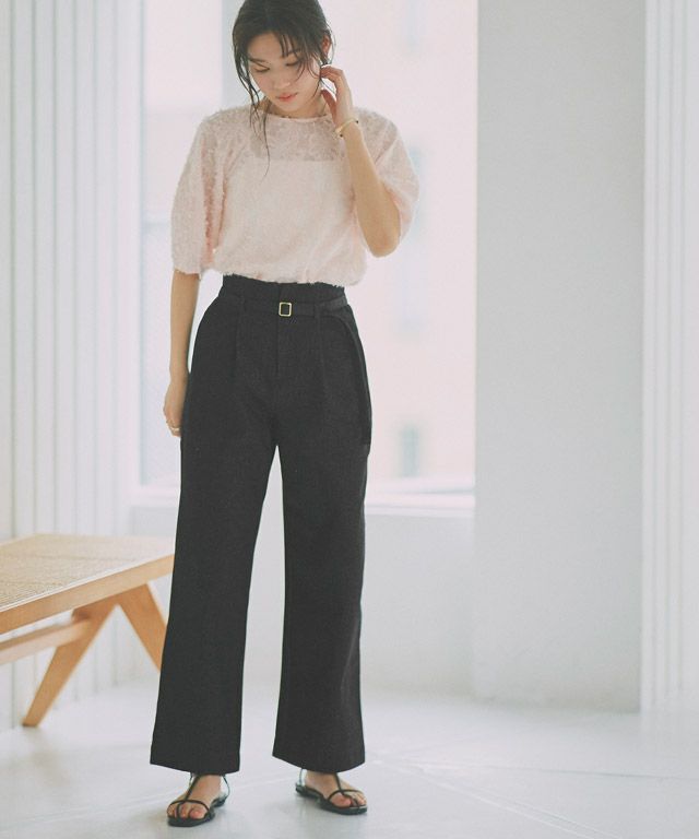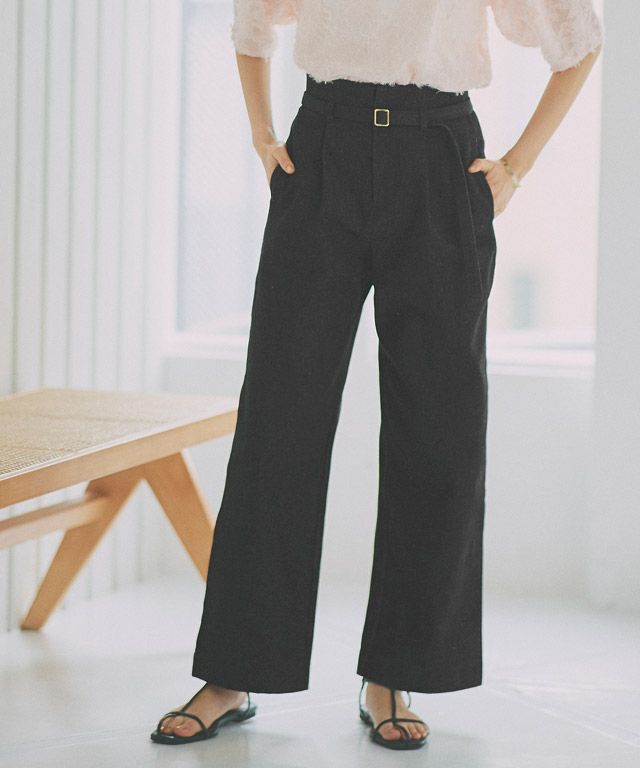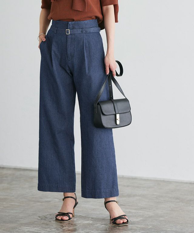 ゴールドバックルのベルトが上品なアクセントを加えてくれるデニム。タックとワイドシルエットでトレンド要素を入れつつ、ベルトがあるのでカジュアルすぎないきちんと感も◎きれいめからカジュアルまで幅広く着回せる一枚です。